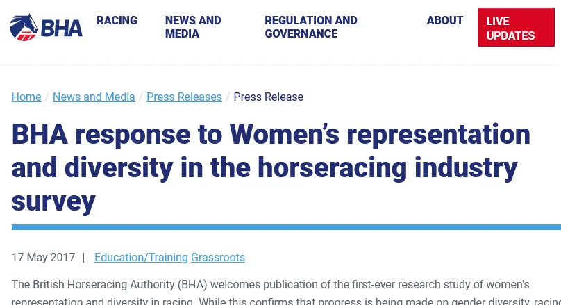 The BHA welcomes publication of the first-ever research study of women's representation and diversity in racing. While this confirms that progress is being made on gender diversity, racing faces similar challenges to other sports in ensuring that people from all backgrounds are represented at all levels of our sport … Many5 people expressed more concern that our industry is not ethnically diverse; regrettably there were few people with a BME background who completed the survey.