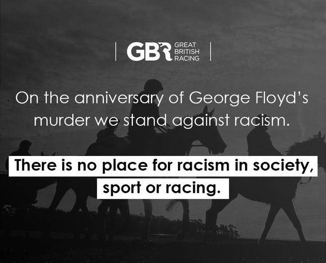 The anniversary of George Floyd’s death, 25 May 2021, was marked by horseracing organisations; the image below was produced by Great British Racing (GBR), racing’s marketing arm.1