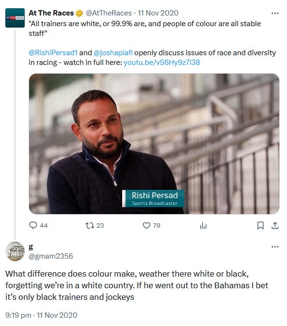 In case the reader is curious, the Twitter thread to which Mr Mottershead referred is here. The tweet quoted by Mr Mottershead as “there’s no issue here” said in full, “How many stable lads get the opportunity to become trainers these days regardless of their skin colour? It’s very hard for anyone to break through unless you have a massive backer or it’s a family business. There is no issue here”. In other words, the writer was arguing the issue was a matter of finance, not race.